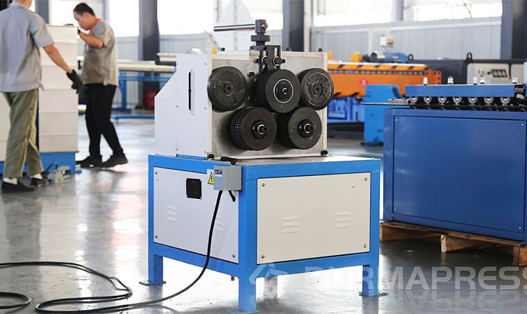 The angle steel round rolling machine is key for making round ducts, enabling good connections. Working with a hydraulic riveting machine, ducts won’t fall off. It has a top rotating lock to adjust the ring diameter, maxing at 400mm.The Angle Steel Round Rolling Machine is used to roll angle steels and other profiles into circular rings and flanges. Its functions are as follows: