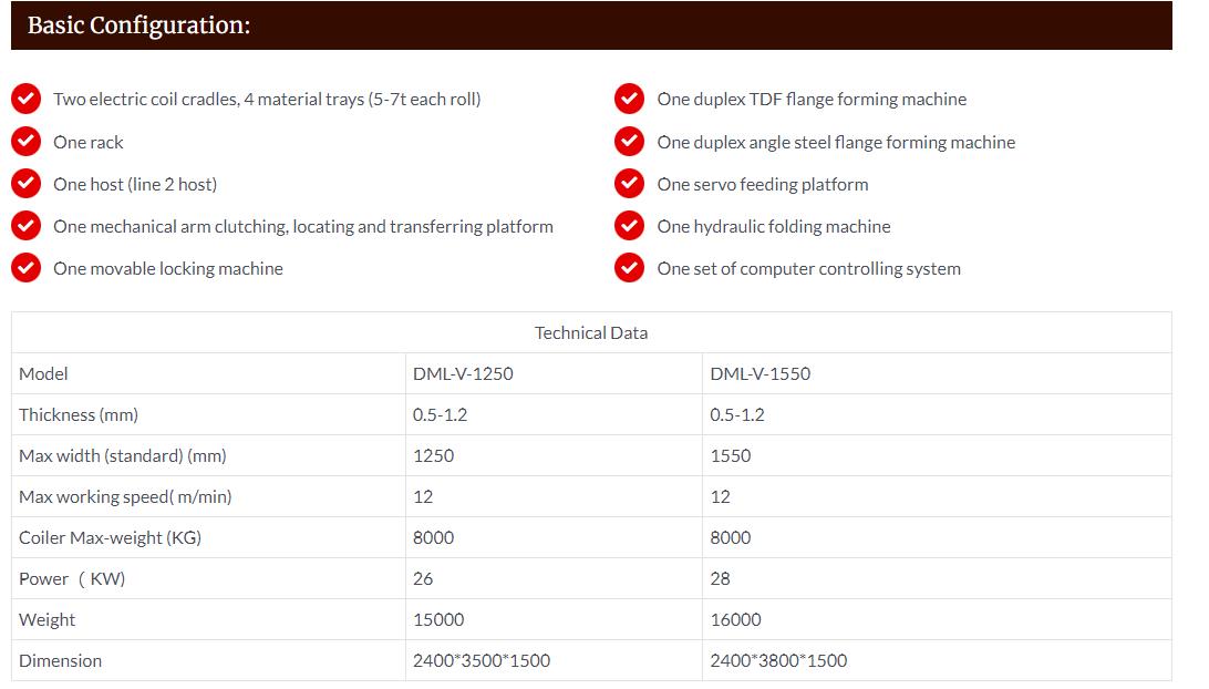 one is linear type V, them composed of a decoiler, leveler grooving unit, “V” and “口” notching unit, cutting unit, bending unit,reciprocating lock former unit, feed extraman unit, duplex flange (angle iron & TDF), automatic folder unit composition;
